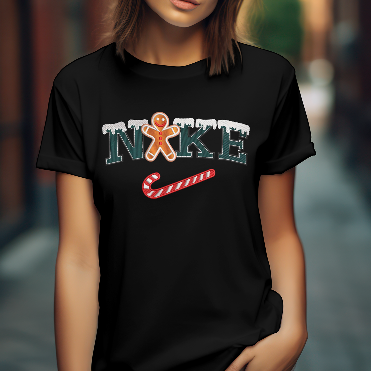 ✨ ¡Felices Fiestas! Una pieza única que fusiona el streetwear con el espíritu navideño. El logo NIKE con nieve, el Hombre de Jengibre en el centro y el Swoosh transformado en un Bastón de Caramelo.
