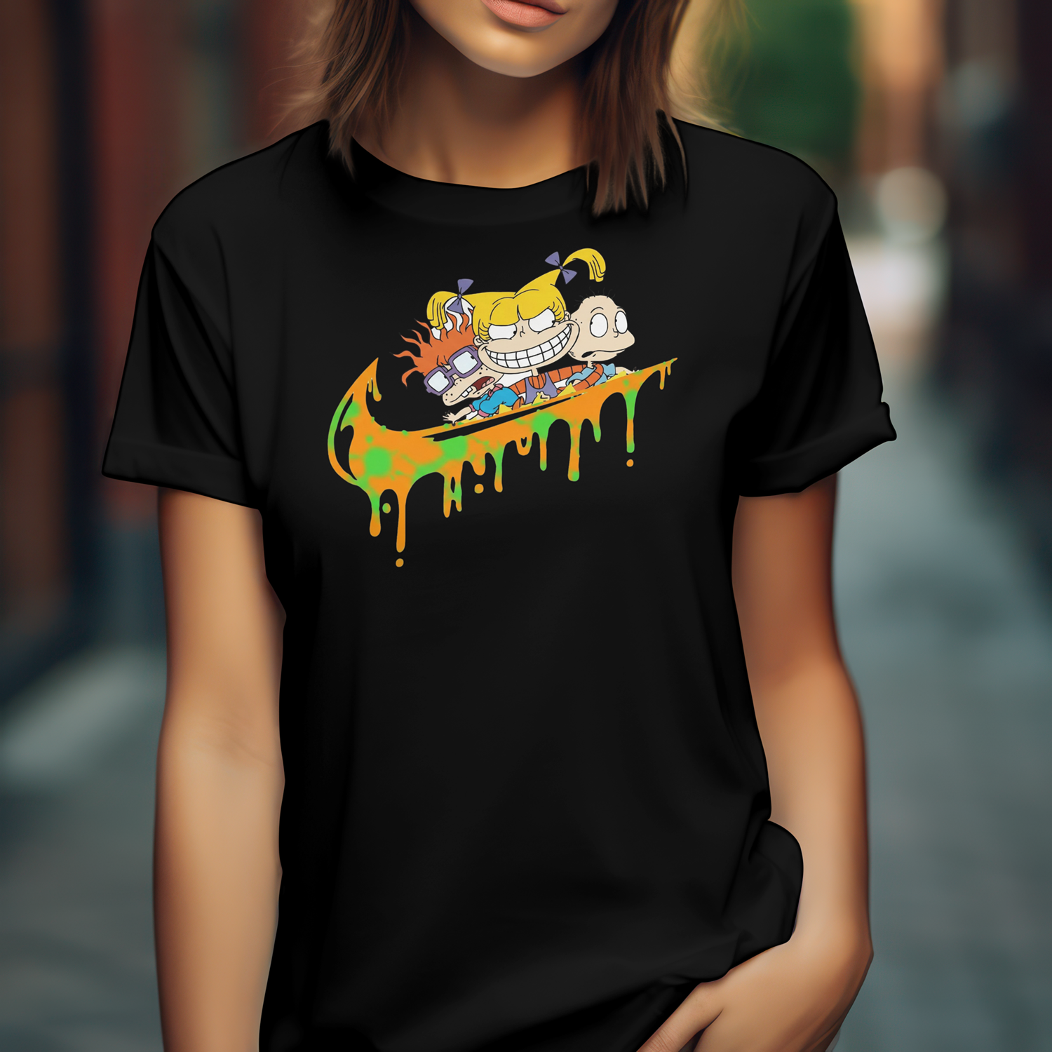 ✨ Regreso a los 90s: Los bebés más famosos, Tommy, Angelica y Chuckie, surfeando el Swoosh con un efecto de goteo de pintura que grita pura irreverencia y nostalgia Nickelodeon.
